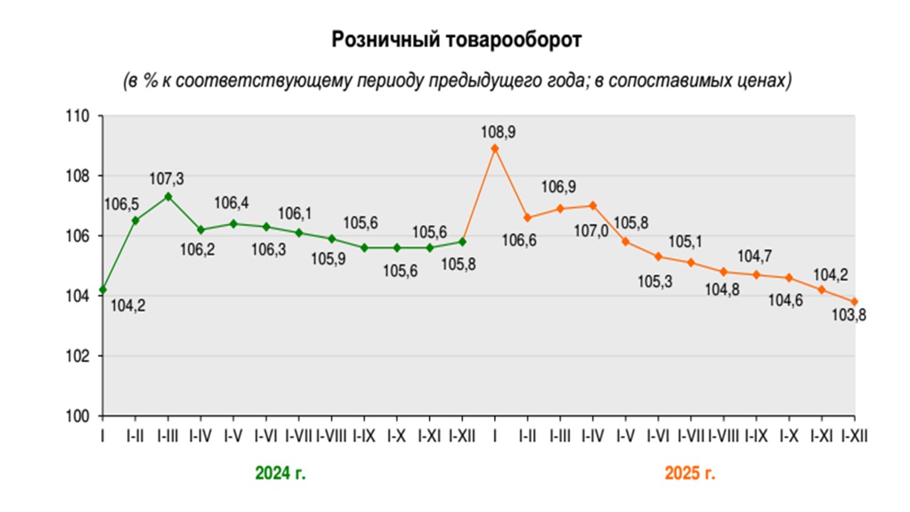 Объем розничного товарооборота торговли через все каналы реализации составил 9,4 млрд. рублей, или 103,8 % к уровню января – декабря 2024 г.